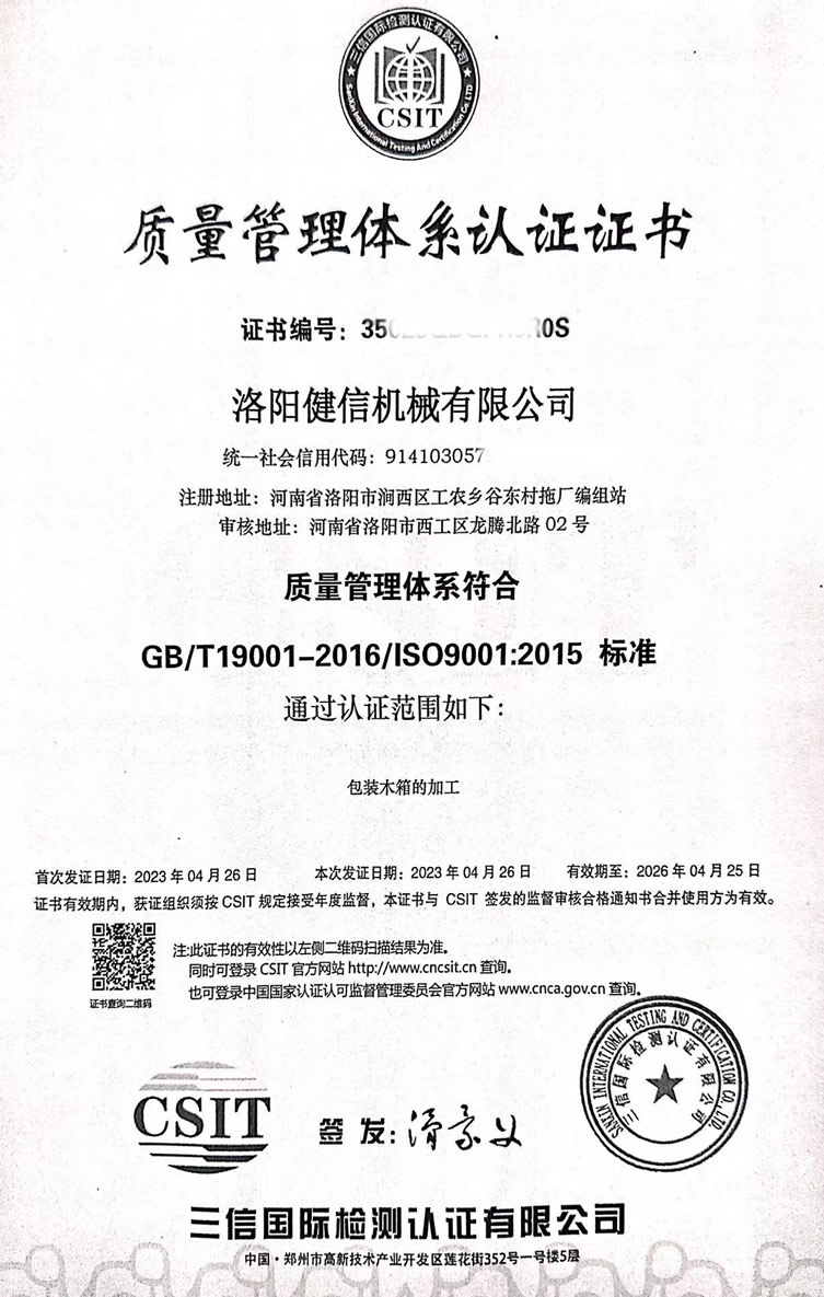 洛阳健信机械有限公司已完成ISO9001质量管理体系的再认证审核,并获得了ISO认证证书。该成让我司提升综合实力过程中的关键进展,标志着公司在木箱包装制度化和规范化、流程精细化管理方面已达到新的高度。